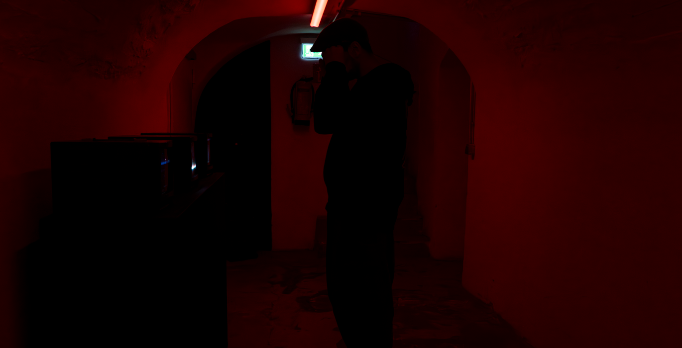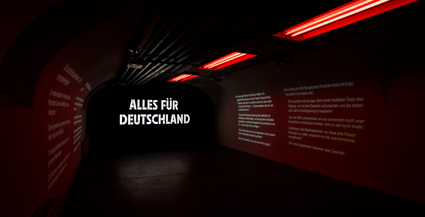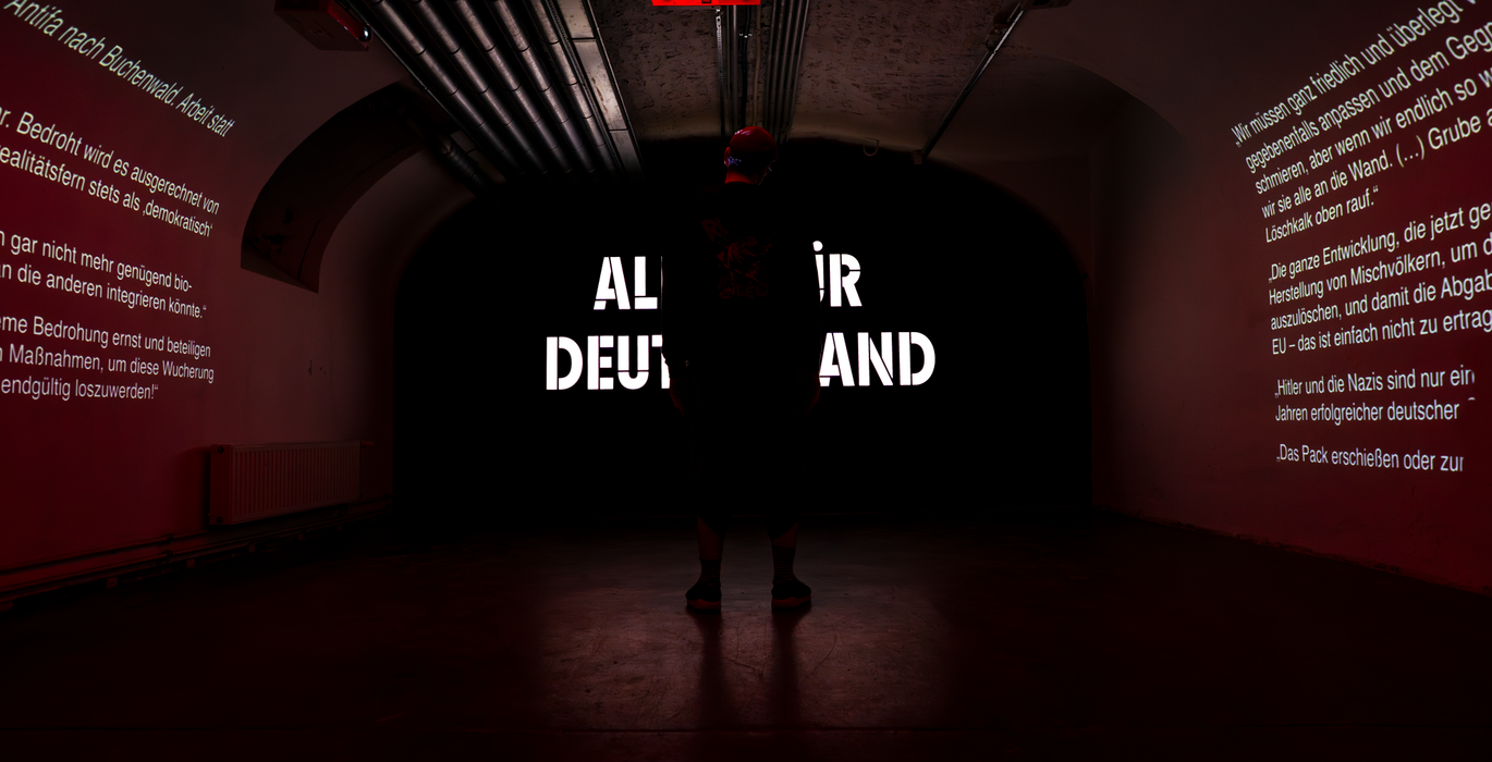Der Hauptraum ist ein bunkerartiger, tiefrot ausgeleuchteter Keller. Sechs Beamer projizieren weiße, animierte Typografie an die Wände: echte, unkommentierte Zitate von AfD-Politiker:innen, die über versteckte Lautsprecher eingesprochen erklingen. Das hallende Echo und die Enge des Raumes lassen die Kälte und Aggression der Worte körperlich erfahrbar werden.