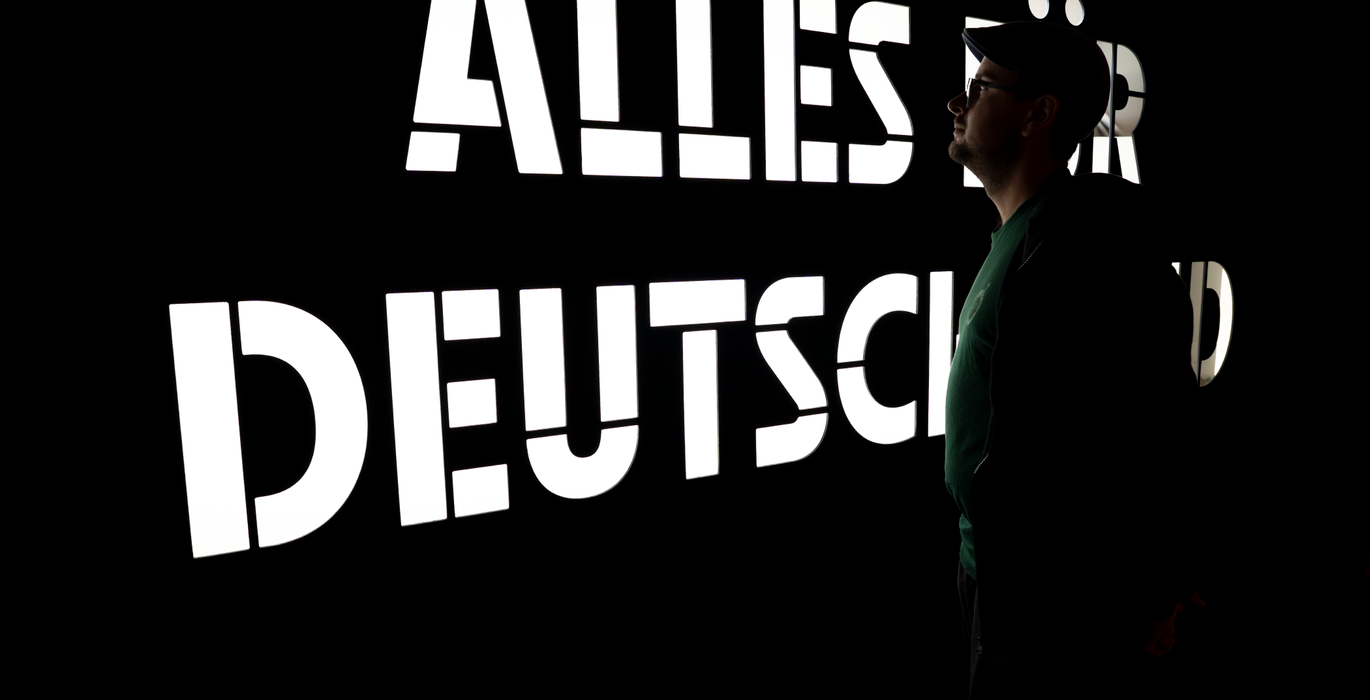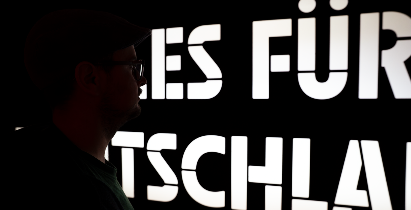 Das zentrale Element ist die Wand mit dem Schriftzug „ALLES FÜR DEUTSCHLAND“, ein exakt in die Raummaße eingepasster Kulissenbau. Die ausgefrästen Buchstaben sind mit Neonflex hinterleuchtet, sodass sich ein flirrendes Spiel zwischen analoger Materialität und der Illusion einer Projektion ergibt.