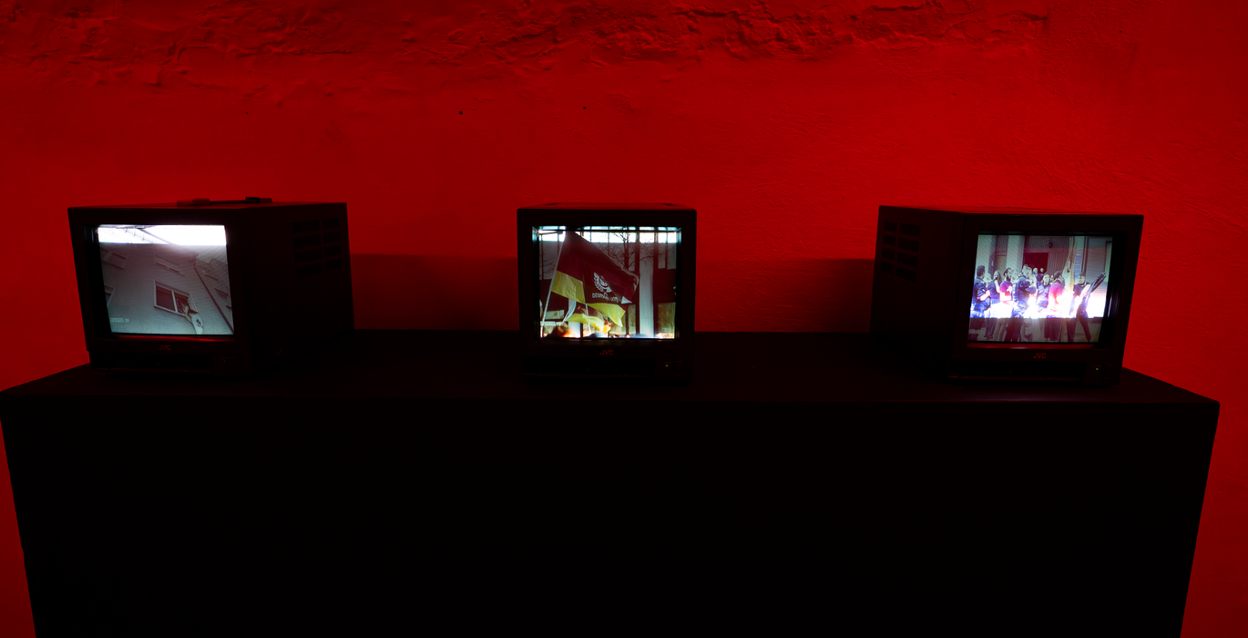 Im Vorraum leiten drei alte Fernsehmonitore in die Installation ein. Sie zeigen Bildmaterial zu rechtsextremer Gewalt, bleiben dabei jedoch bewusst stumm – ihre Präsenz ist akustisch dennoch spürbar. Das hohe, durchdringende Pfeifen der Bildröhren erzeugt eine körperliche Irritation, die von manchen Besucher:innen als schmerzhaft empfunden wurde. So entsteht ein stiller, aber aggressiver Auftakt, der die Empfindlichkeit gegenüber Gewalt und Hass schärft.