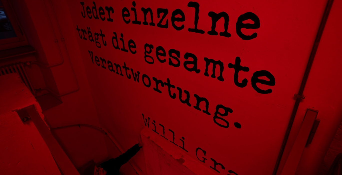 Die Installation „Hallender Hass“ ist ein immersiver Erfahrungsraum, der die Normalisierung rechter Rhetorik im öffentlichen Diskurs körperlich spürbar macht. Besucher:innen steigen über eine rot ausgeleuchtete Treppe hinab, über der das Zitat „Jeder Einzelne trägt die ganze Verantwortung.“ von Willi Graf angebracht ist. Beim Eintreten wirkt es fast beiläufig – beim Hinausgehen, nach der Auseinandersetzung mit der Installation, entfaltet es seine ganze Wucht.