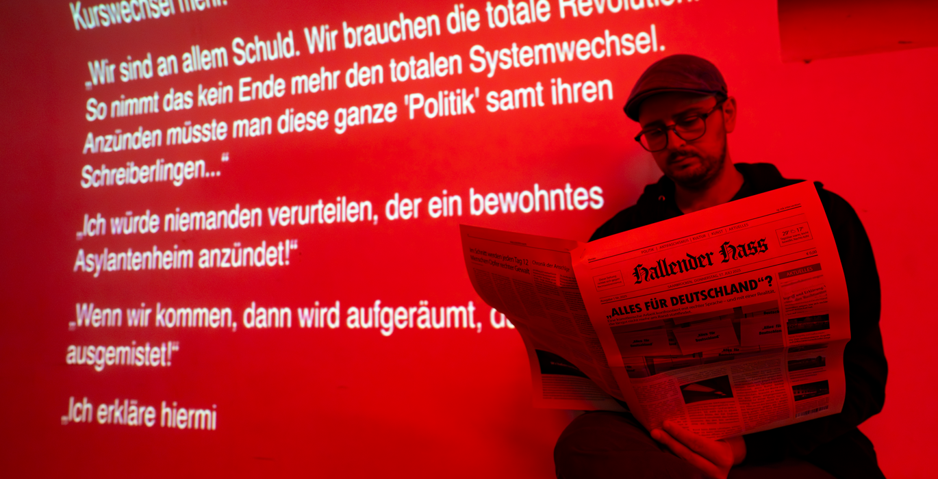 „Hallender Hass“ ist keine Reproduktion rechter Inhalte, sondern eine künstlerische Auseinandersetzung mit der Gewalt politischer Sprache. Die Arbeit schafft einen Erfahrungsraum, der verstört, berührt und ein Innehalten provoziert – und der die Frage nach der eigenen Verantwortung unausweichlich macht.