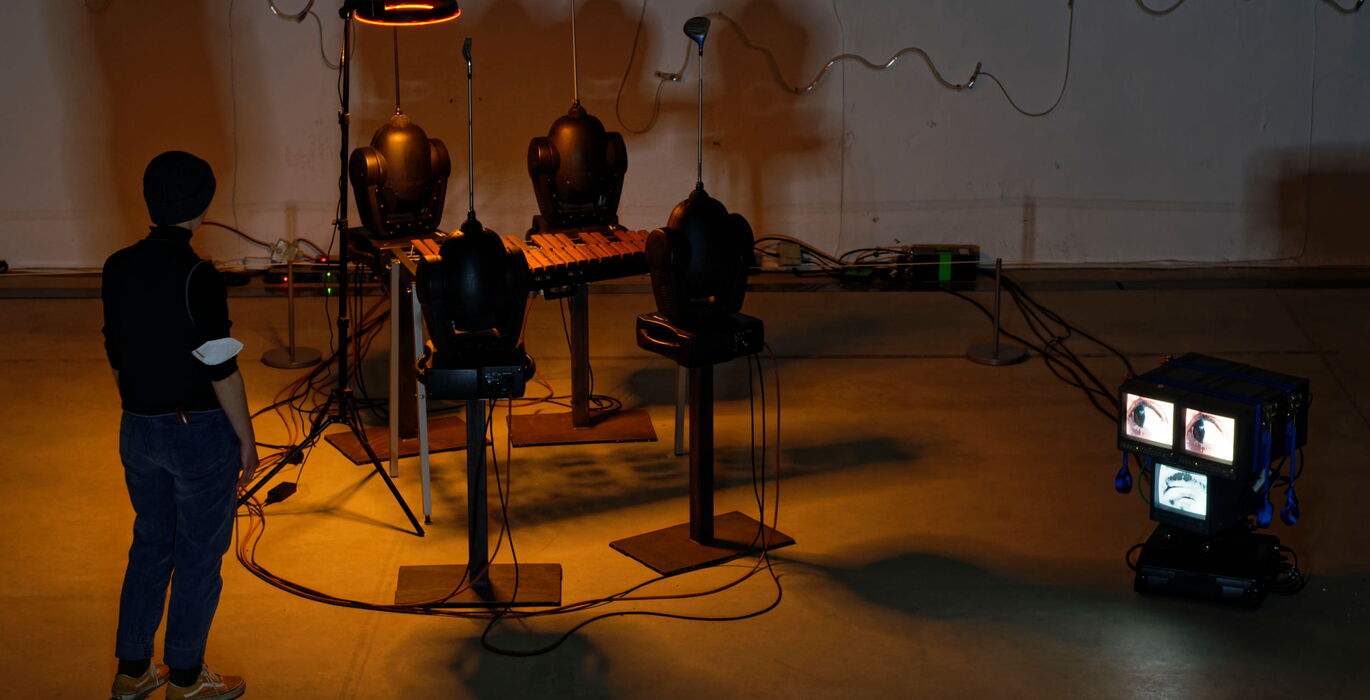 Die Installation entführt den:die Rezipienten:in in eine eigentümliche Situation. Vier soldatisch aus motorischen Scheinwerfern und Golfschlägern gefertigt wurden, thronen auf Barhockern, angeordnet um ein Xylophon.