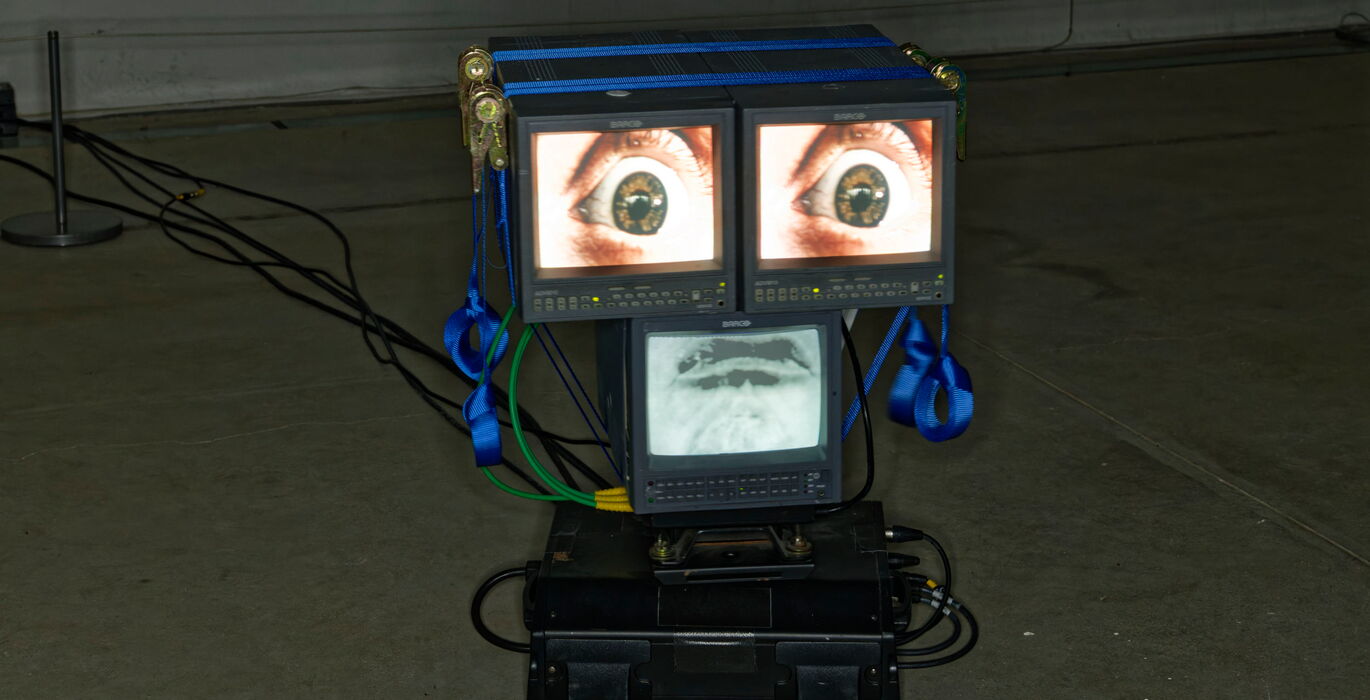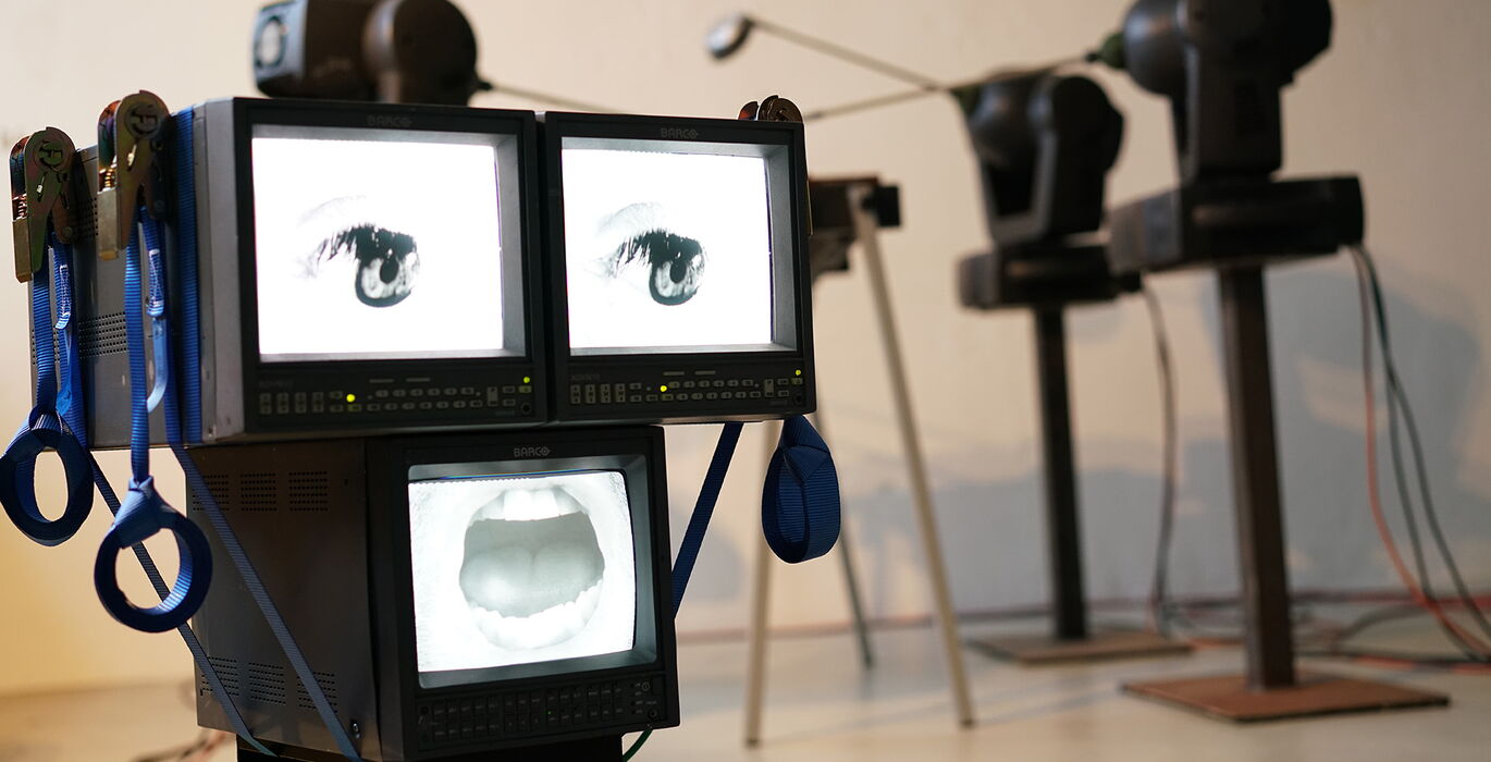 Ein aus Bildschirmen und Elektroschrott gebauter Kopf unweit der Golfroboter schaut sich die komische Runde an. Er scheint sie zu überwachen, aufzupassen, dass sie nicht auf dem Xylophon zu spielen beginnen. Zuweilen dreht sich der Kopf in den Raum hinein, schweift ab von seiner Kontrollfunktion. Die Golfroboter lassen keine unbeobachtete Gelegenheit aus, um auf dem Xylophon herum zu klimpern oder komische Balletttänze zu tanzen. Der Aufpasser scheint das zu merken und dreht sich schnell wieder zu Ihnen um, kontrolliert die Ausreißer, bis das Spiel von Neuem beginnt.